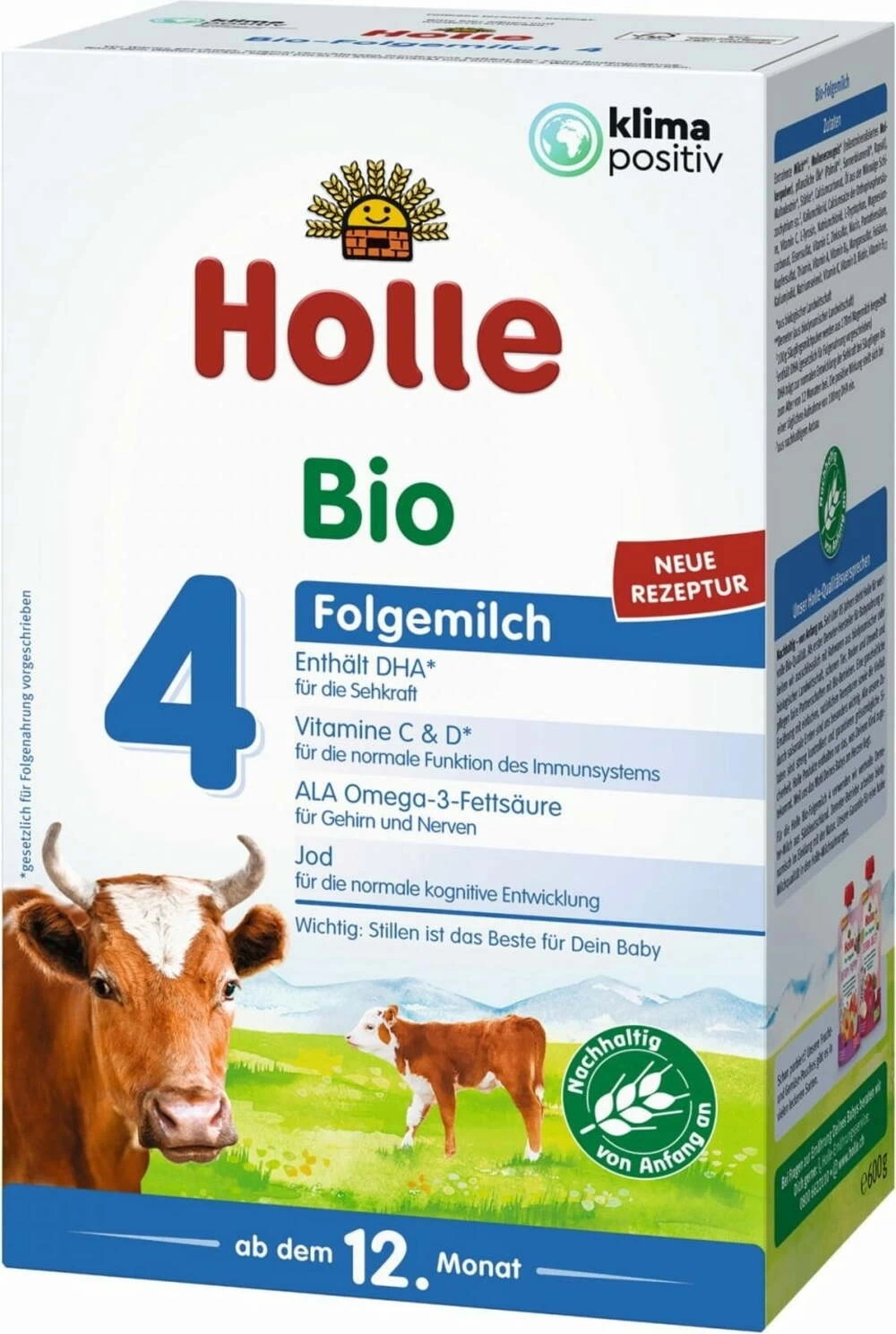 Holle Organic Infant Follow-on Formula 4. This growing-up milk is suitable from the 12th month to the end of the 3rd year of life as part of a mixed diet of bottle feeds and weaning. It can be used after breastfeeding or at any time instead of another follow-on formula. The milk formula can also be used to prepare Holle Organic Junior Mueslis or Holle Organic Porridges.