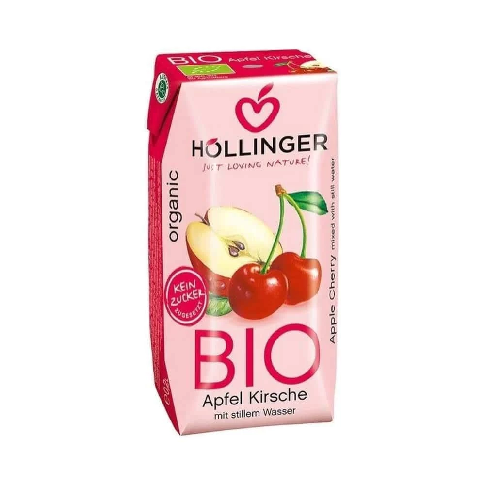 Höllinger Organic Apple Cherry with still water does not need sugar (naturally contains sugar from the fruit). This natural refreshment consists only of apple juice, sour cherry juice and water. Ideal for in-between and on the road.